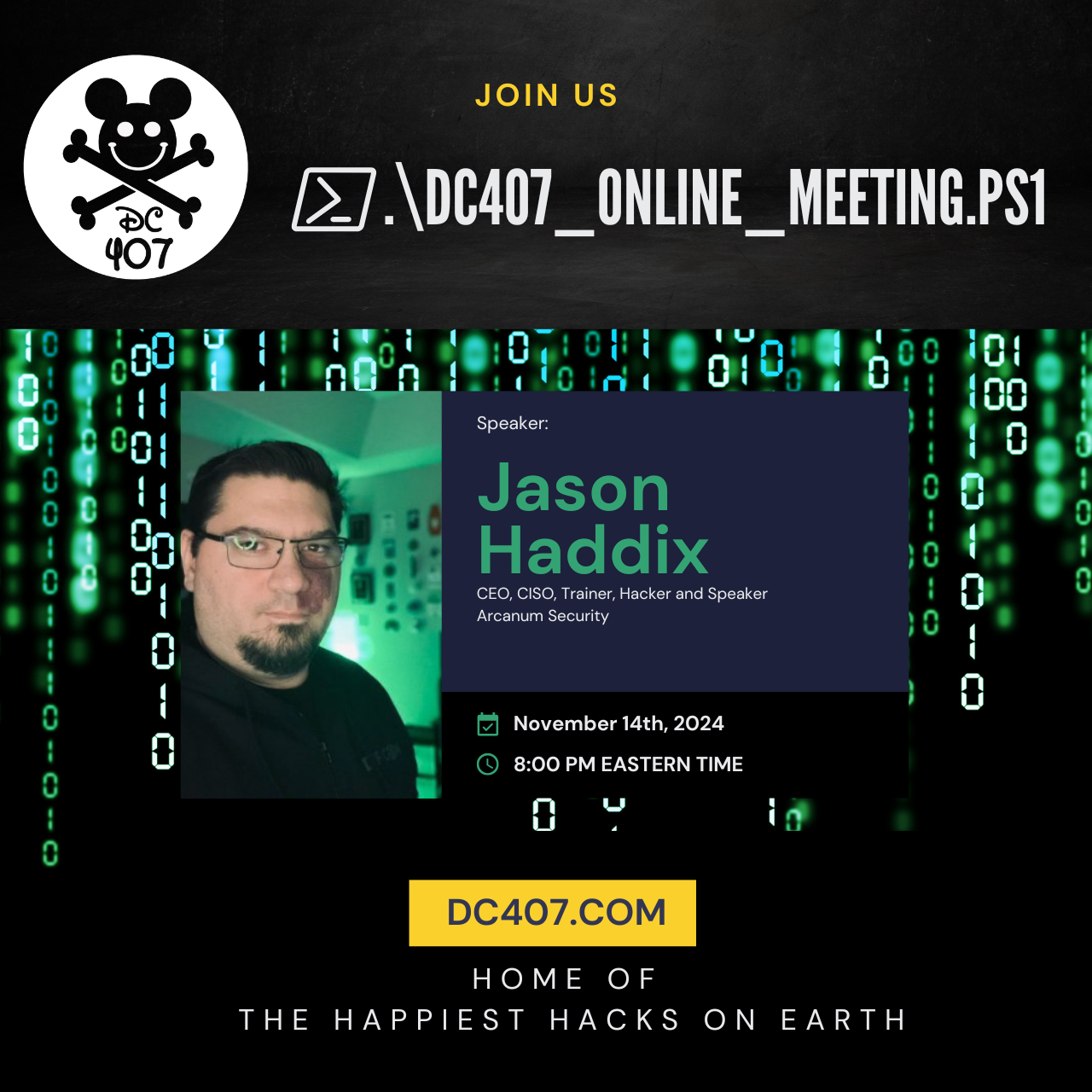 We have our regularly scheduled DC407 monthly in-person meeting on next Tuesday, October 29, 2024 at 7PM at Colo Solutions !! Feel free to dress up in costume (but this is completely optional).